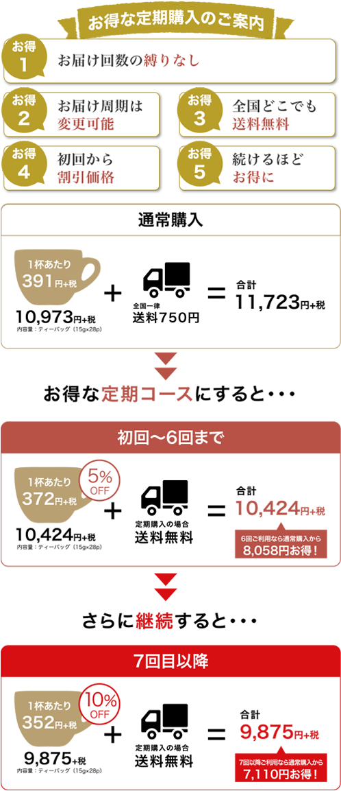 注文忘れがなくて便利なのに加えて、初回から6回目までは5%OFF、7回目以降は10%OFFや送料が無料になるなどお得な特典があるのでオススメのコースです。